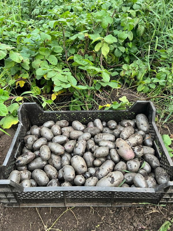 Een bijzondere en smaakvolle aardappel. Paarse schil en paars gemêleerd vruchtvlees! Blijft ook paars na koken!