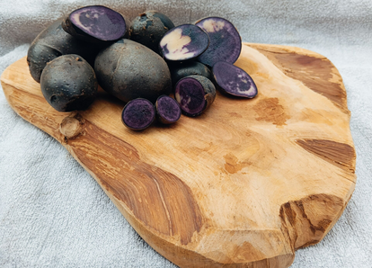 Een bijzondere en smaakvolle aardappel. Paarse schil en paars gemêleerd vruchtvlees! Blijft ook paars na koken!